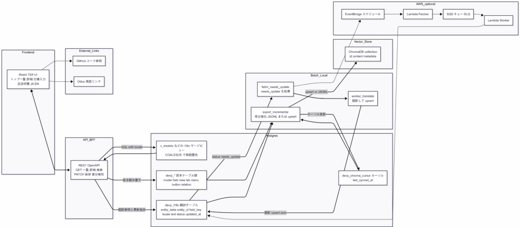 PATCH実装 →needs_updateupsert を確認 - ローカル翻訳バッチを cron で回し、英語表示が反映されることを確認